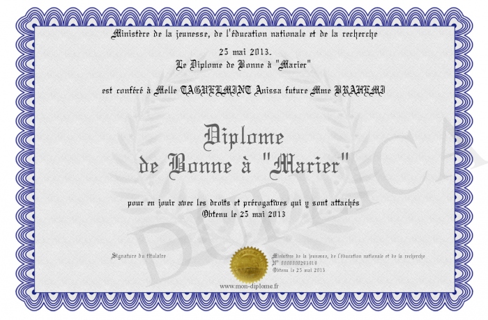 Envoyez par email votre Diplôme de Bonne à -Marier- personalisé