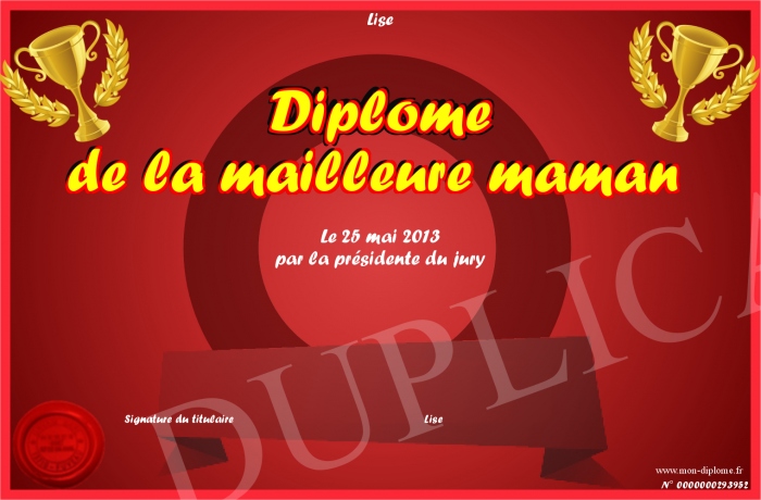 Envoyez par email votre Diplôme de la mailleure maman personalisé