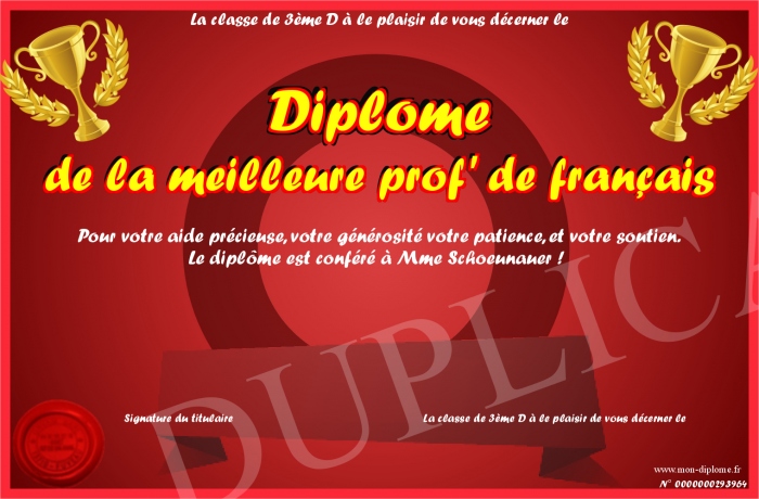 Envoyez par email votre Diplôme de la meilleure prof' de français personalisé