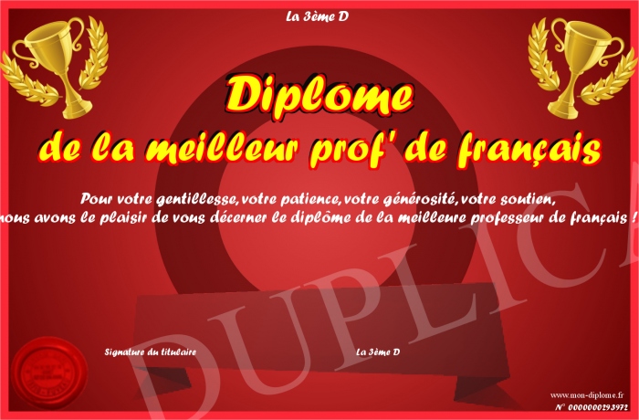 Envoyez par email votre Diplôme de la meilleur prof' de français personalisé