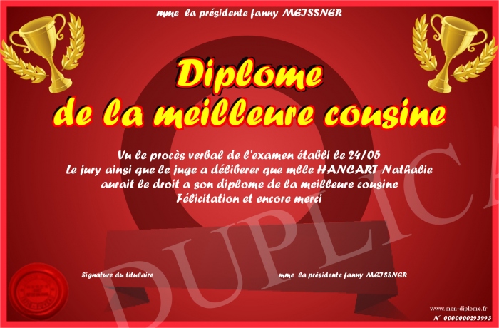 Envoyez par email votre Diplôme de la meilleure cousine personalisé