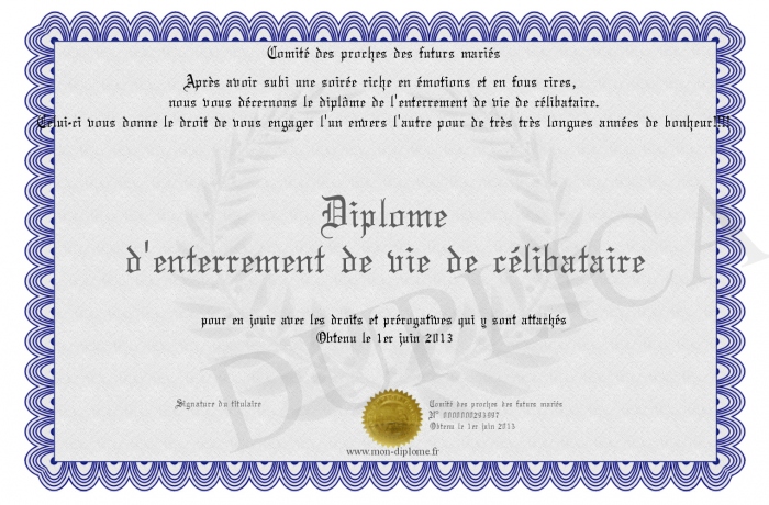 Envoyez par email votre Diplôme d'enterrement de vie de célibataire personalisé