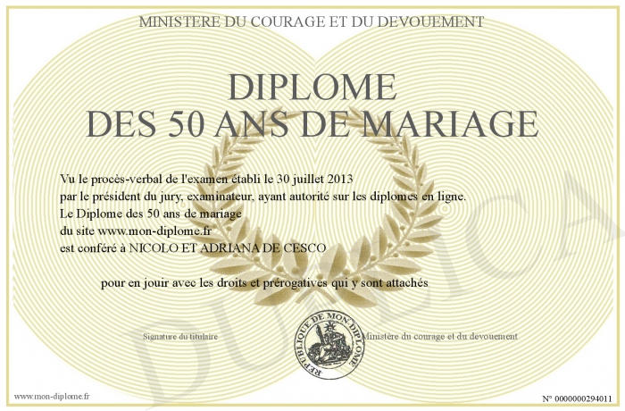 Envoyez par email votre Diplôme des 50 ans de mariage personalisé