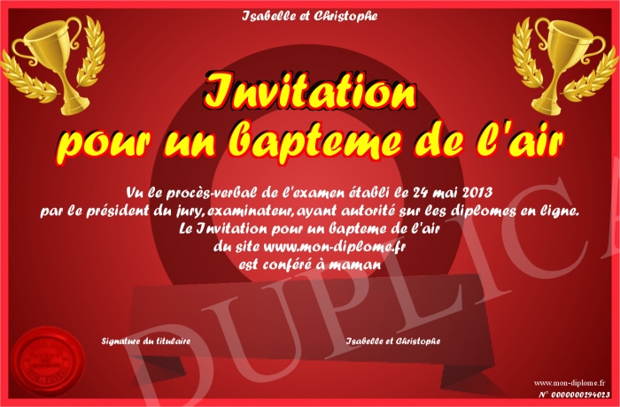 Envoyez par email votre Invitation pour un bapteme de l'air personalisé