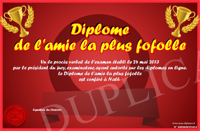Envoyez par email votre Diplôme de l'amie la plus fofolle personalisé