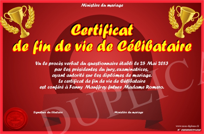 Envoyez par email votre Certificat de fin de vie de Célibataire personalisé