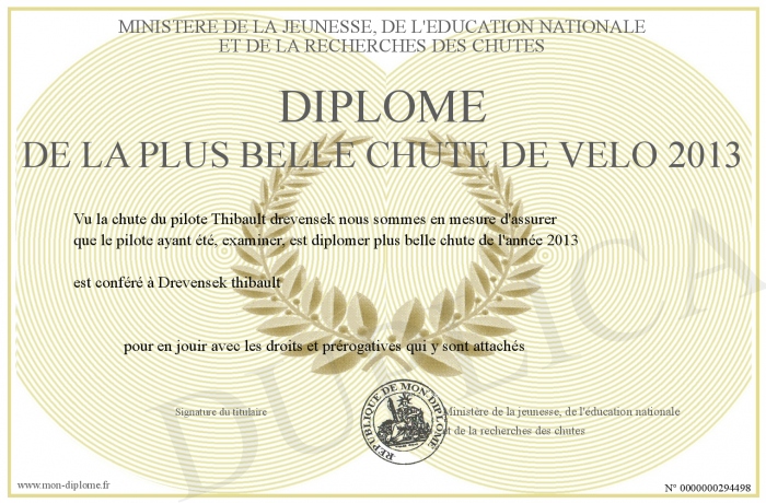 Envoyez par email votre Diplôme de la plus belle chute de velo 2013 personalisé