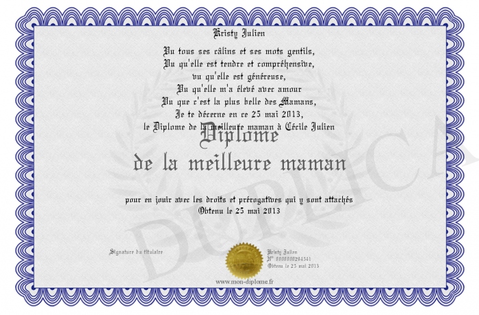 Envoyez par email votre Diplôme de la meilleure maman personalisé