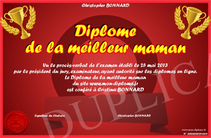 Envoyez par email votre Diplôme de la meilleur maman personalisé