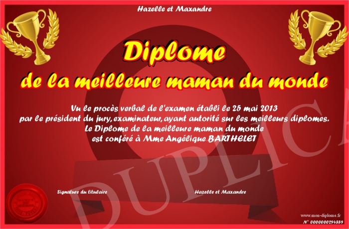 Envoyez par email votre Diplôme de la meilleure maman du monde personalisé