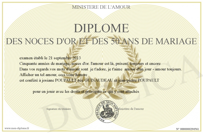 Envoyez par email votre Diplôme des noces d'or et des 50 ans de mariage personalisé