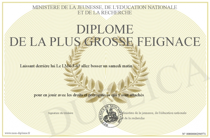 Envoyez par email votre Diplôme de la plus grosse feignace personalisé