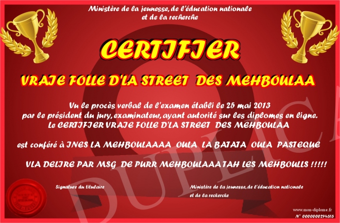 Envoyez par email votre CERTIFIER VRAIE FOLLE D'LA STREET DES MEHBOULAA personalisé