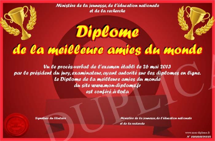 Envoyez par email votre Diplôme de la meilleure amies du monde personalisé