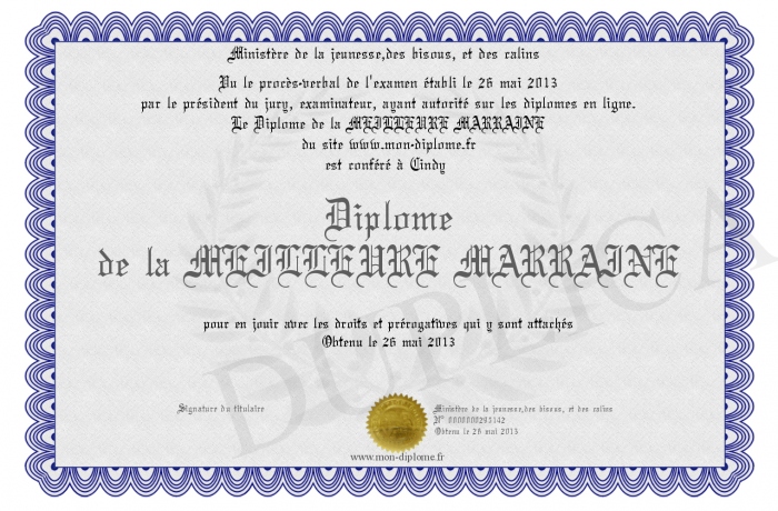 Envoyez par email votre Diplôme de la MEILLEURE MARRAINE personalisé