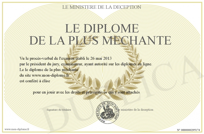 Envoyez par email votre le diplôme de la plus méchante personalisé