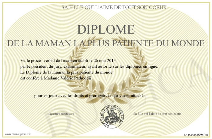 Envoyez par email votre Diplôme de la maman la plus patiente du monde personalisé