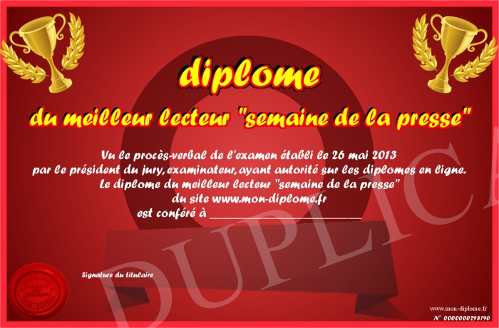 Envoyez par email votre diplôme du meilleur lecteur -semaine de la presse- personalisé