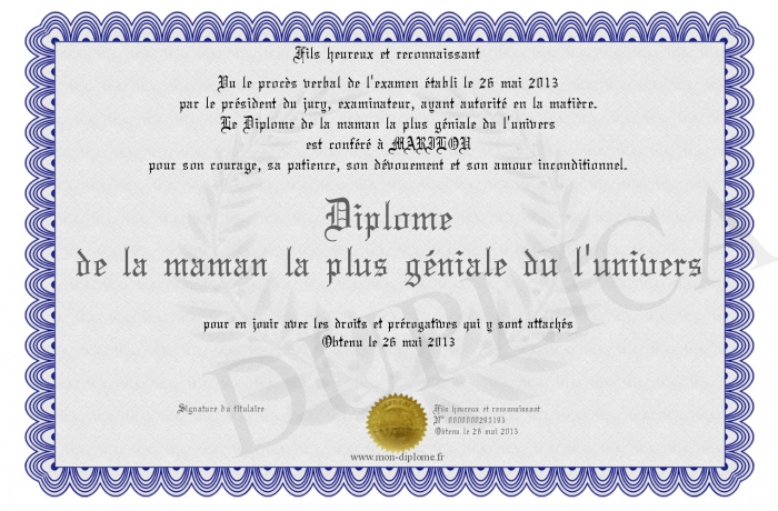 Envoyez par email votre Diplôme de la maman la plus géniale du l'univers personalisé