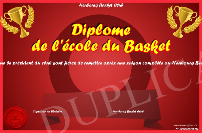 Envoyez par email votre Diplôme de l'école du Basket personalisé