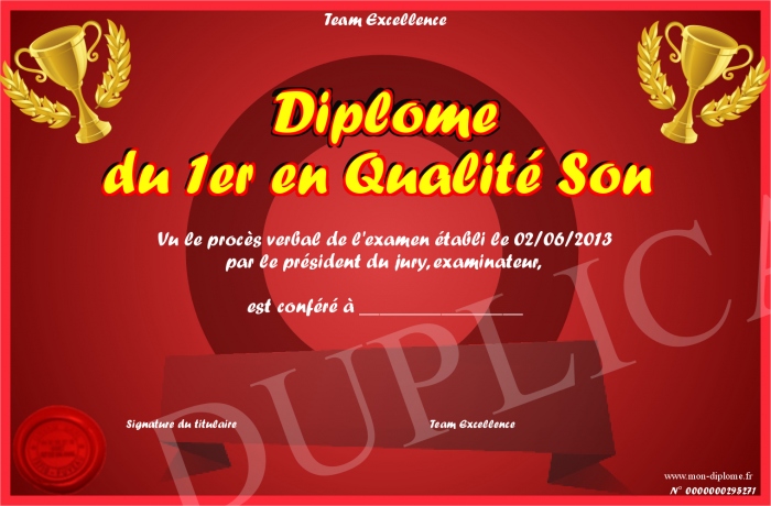 Envoyez par email votre Diplome du 1er en Qualité Son personalisé