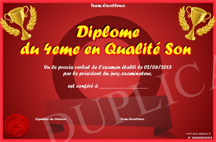 Envoyez par email votre Diplome du 4eme en Qualité Son personalisé
