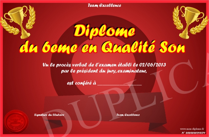 Envoyez par email votre Diplome du 6eme en Qualité Son personalisé