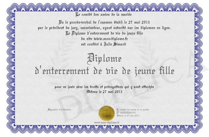 Envoyez par email votre Diplôme d'enterrement de vie de jeune fille personalisé