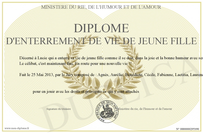 Envoyez par email votre Diplôme d'enterrement de vie de jeune fille personalisé