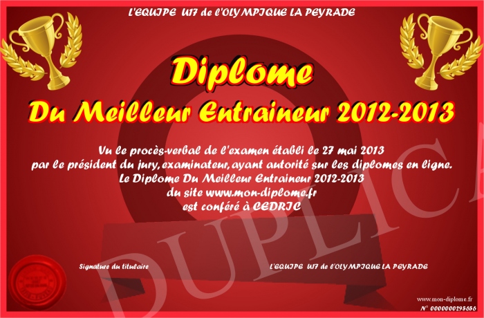 Envoyez par email votre Diplôme Du Meilleur Entraineur 2012-2013 personalisé