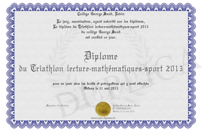 Envoyez par email votre Diplôme du Triathlon lecture-mathématiques-sport 2013 personalisé