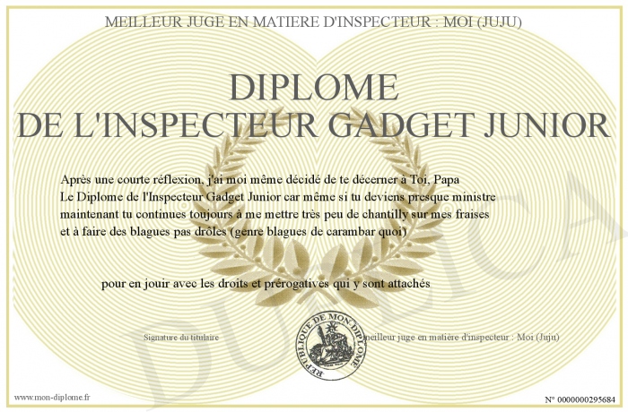 Envoyez par email votre Diplôme de l'Inspecteur Gadget Junior personalisé