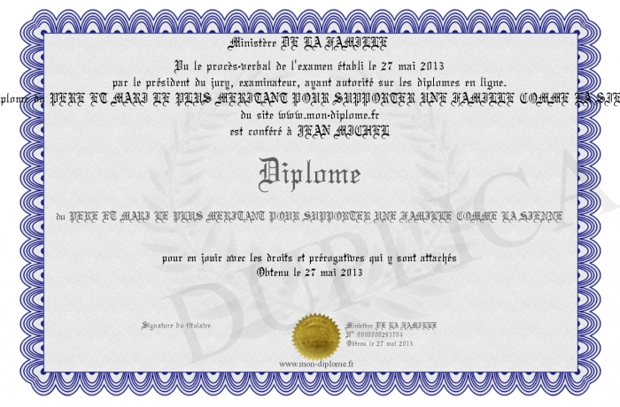 Envoyez par email votre Diplôme du PERE ET MARI LE PLUS MERITANT POUR SUPPORTER UNE FAMILLE COMME LA SIENNE personalisé