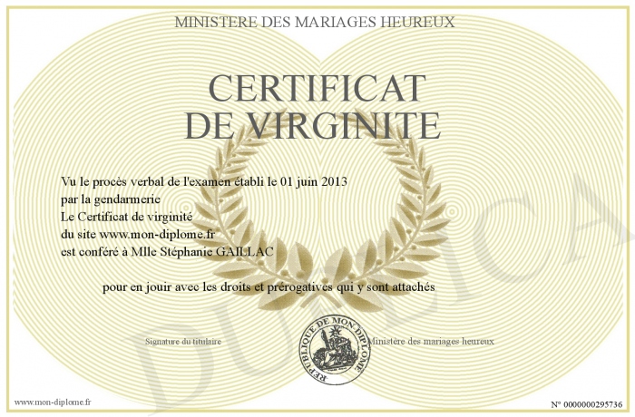 Envoyez par email votre Certificat de virginité personalisé