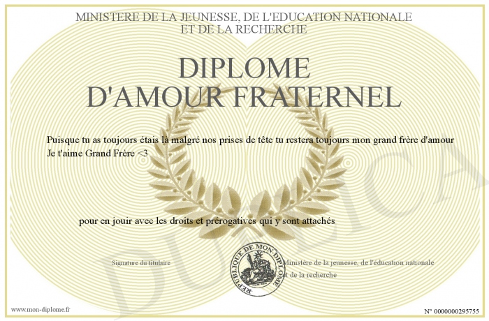 Envoyez par email votre Diplôme d'amour fraternel personalisé