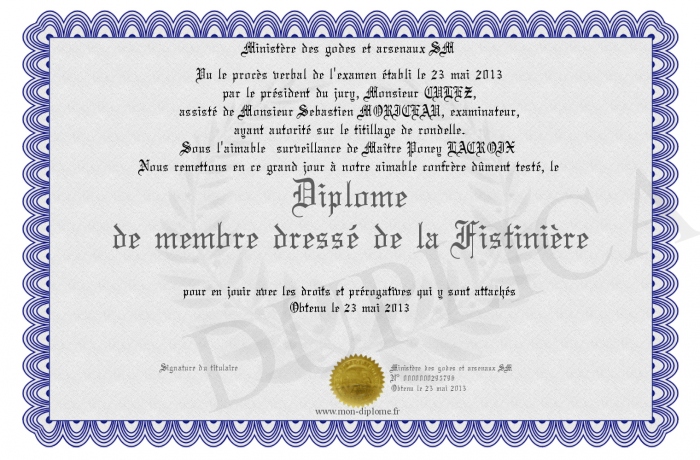 Envoyez par email votre Diplôme de membre dressé de la Fistinière personalisé