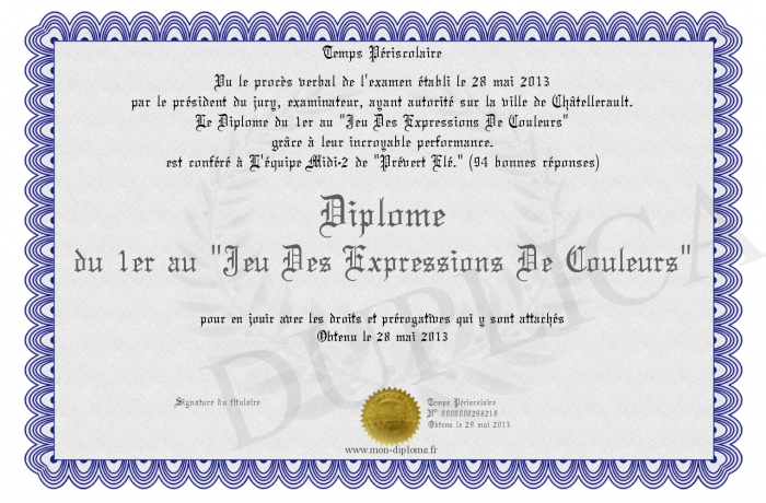 Envoyez par email votre Diplôme du 1er au -Jeu Des Expressions De Couleurs- personalisé