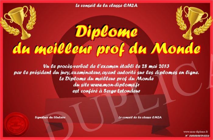 Envoyez par email votre Diplôme du meilleur prof du Monde personalisé