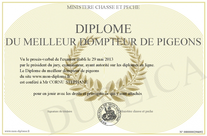 Envoyez par email votre Diplôme du meilleur dompteur de pigeons personalisé