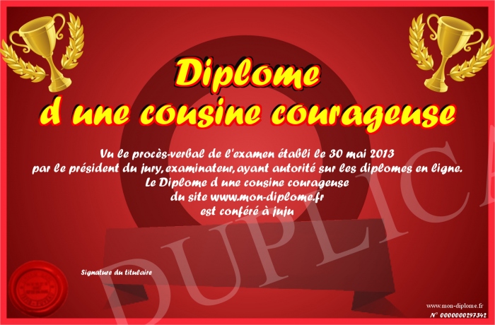 Envoyez par email votre Diplôme d une cousine courageuse personalisé