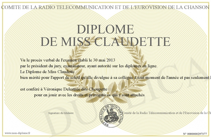 Envoyez par email votre Diplôme de Miss Claudette personalisé