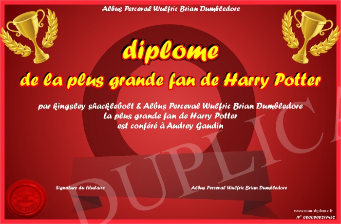 Envoyez par email votre diplome de la plus grande fan de Harry Potter personalisé