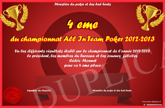 Envoyez par email votre 4 eme du championnat All In Team Poker 2012-2013 personalisé