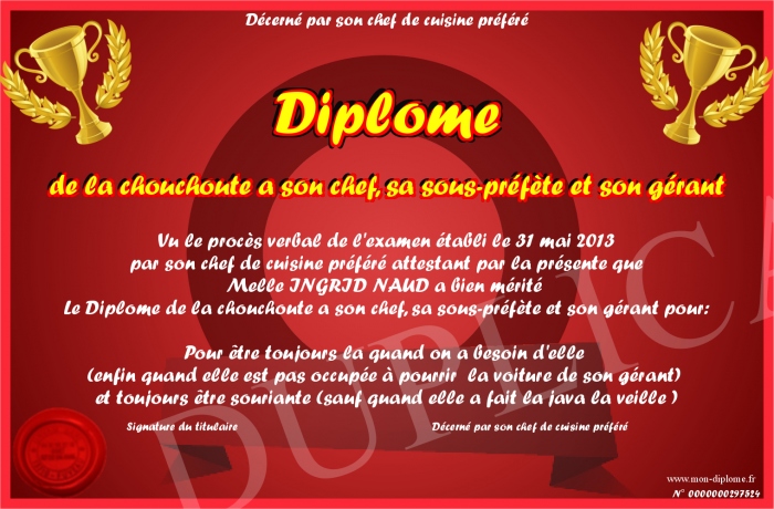 Envoyez par email votre Diplôme de la chouchoute a son chef, sa sous-préfète et son gérant personalisé