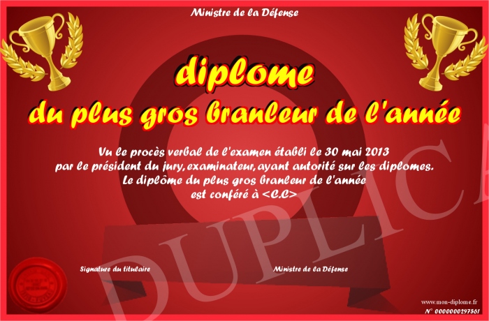 Envoyez par email votre diplôme du plus gros branleur de l'année personalisé
