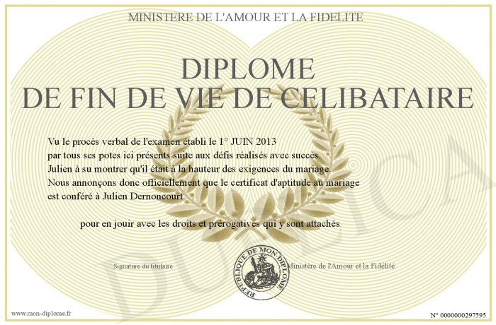 Envoyez par email votre Diplôme de fin de vie de célibataire personalisé