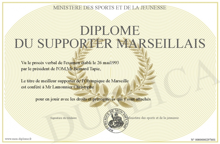 Envoyez par email votre Diplôme du supporter marseillais personalisé