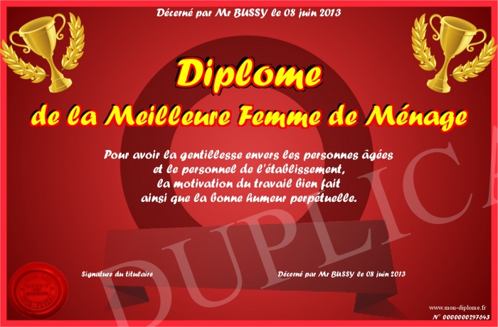 Envoyez par email votre Diplôme de la Meilleure Femme de Ménage personalisé