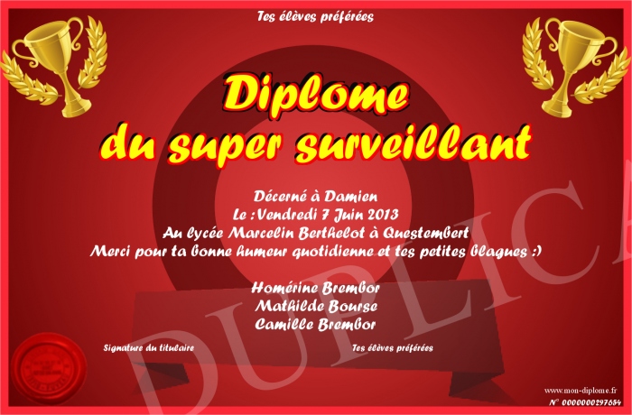 Envoyez par email votre Diplôme du super surveillant personalisé