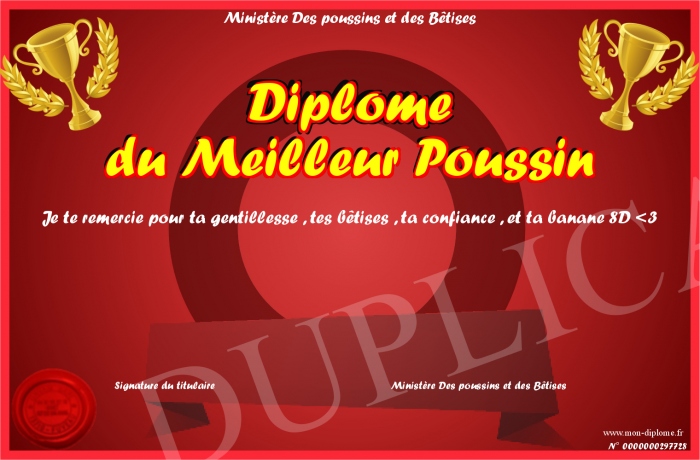 Envoyez par email votre Diplôme du Meilleur Poussin personalisé